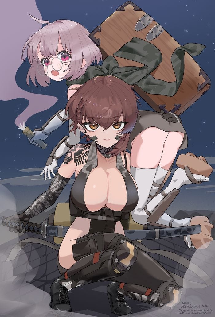 2人の全身が入っているけど、もっと描く範囲を絞ったほうがよかったかも。デルタがシグナルをかっこよく担いでるところを描きたかったわけだから、足元まで描かないでいい。デルタの足のプロテクターは複雑で大変だった。そこは画面外に出しちゃえば、その分二人の重なりや表情を精細にするのに力を回せる。でも、全身を入れたくなっちゃうんだよなあ。