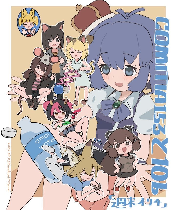 参加した創作作品集に登場するキャラクターと小物、サークルのマスコットをまとめて描いたイラスト。この次の週末にひらかれるコミティアで本が頒布されるので、テーブル番号を書いてお知らせとしてネットに投稿した。各作品のファンアートをしながら宣伝もできてお得。