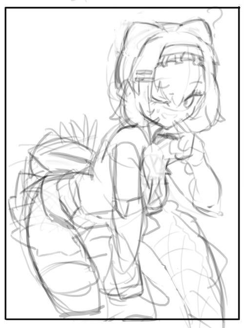 ラフはこうでした。左のところで描きたいポーズや表情を書き出しておいてから、右により立体的で詳細なラフを描きました。画面外の足も軽く描いて、重心が乗ったポーズにできたんじゃないでしょうか。